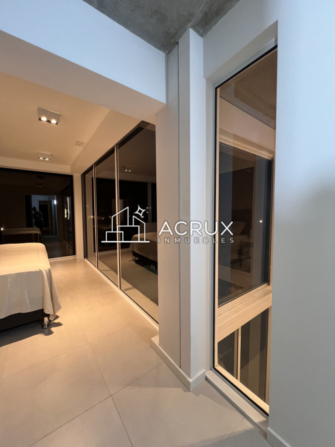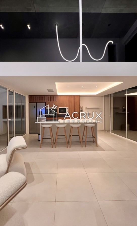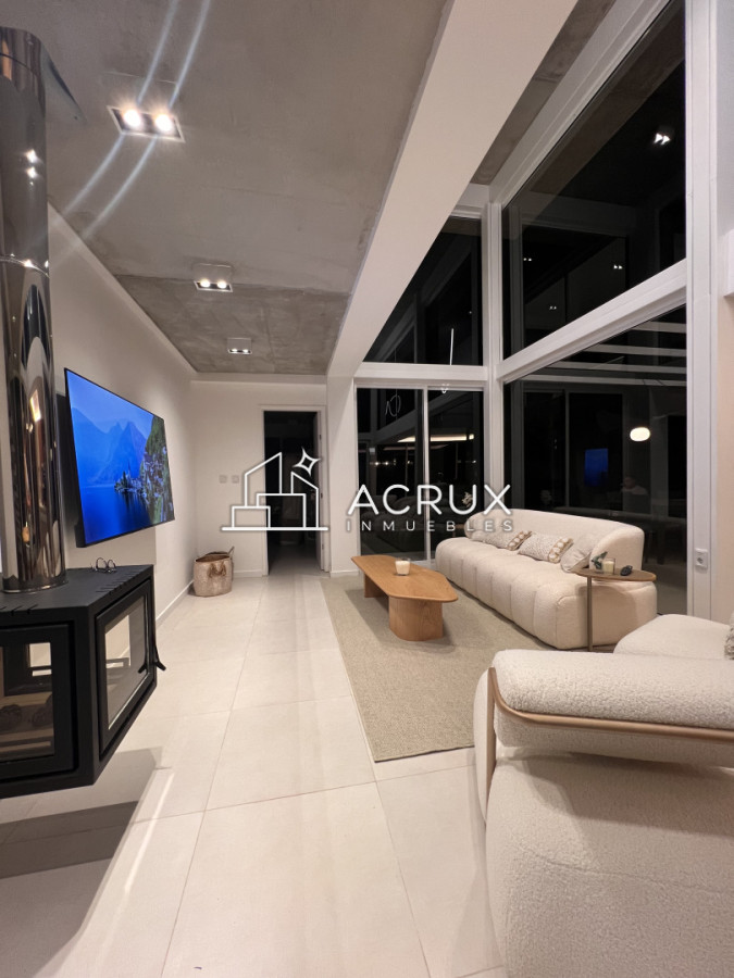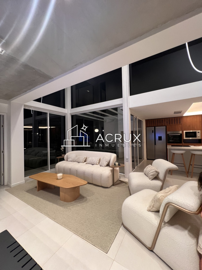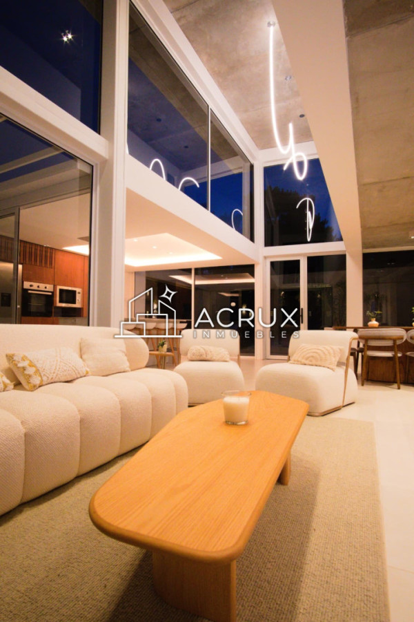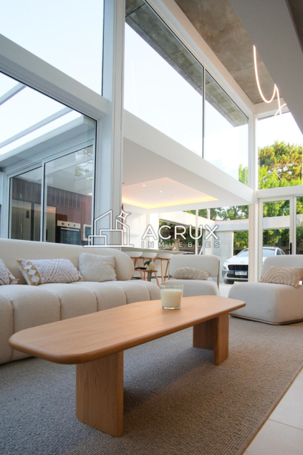 -living en doble altura con ventanas de piso a techo.
